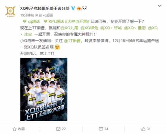 12月11日,王者荣耀XQ战队与国内领先的游戏社交平台TT语音达成深度合作,战队所有队员也将会在TT语音平台上举办多场水友赛与玩家一起开黑。同时TT语言官方还将在平台内上线青训招募计划,希望能借此机会让队员们把自己的专业技能传授给更多怀揣电竞梦想的年轻人,为中国电竞行业输送专业人才。