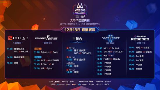在经历了2天的小组赛争夺后,12月13日起,WESG2019-2020赛季大中华区总决赛4大正式项目均已进入白日化的淘汰赛阶段,其中DOTA2项目与实况足球2020项目将会在今日展开最后的冠亚季军争夺战,线下观赛资格也将在今日正式开放,届时,我们将在苏州高新区文体中心共同见证CNDOTA2冠军及CN实况冠军的诞生,开幕式将于早上11:30开启,中国DOTA2最强战队LGD与黑马战队EHOME·I战队也将在开幕式之后迎来主舞台第一场揭幕战。