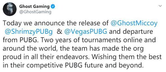 ghost作为北美赛区的一支传统强队一直活跃在NA PUBG舞台上,今日ghost官推宣布除Miccoy、Shrimzy、Vegas三人正式离队,DrasseL留队转型为专职主播,原战队教练Jabroni将留在内部运营团队。