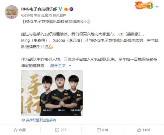 最后,感谢粉丝们一直以来对RNG电子竞技俱乐部以及三位选手的喜爱与支持。