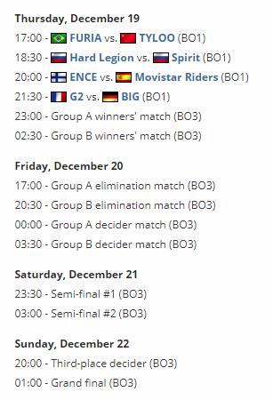 本次奖金为30万美元的欧洲冠军杯决赛,将于12月19至22日在马耳他的圣朱利安洲际酒店举行。届时八支队伍将被分为两组,除去首轮BO1外余下均为BO3赛制。
