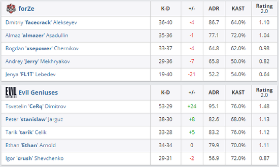 图二forZe选出Nuke,但先做进攻方的他们实在是无力撼动EG的钢铁防线,尤其是火力全开的CeRq,一把狙击枪让forZe的进攻完全无法展开,上半场一个绝望的14-1过后,下半场forZe仅挣扎着扳回三分,最终EG以16-4拿下图二,2-0战胜forZe晋级胜者组。