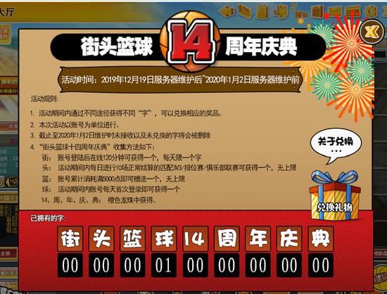 活动期间内通过不同途径获得不同“字”,可以兑换相应的奖品,本次活动以账号为单位进行。“街头篮球十四周年庆典”收集方法如下:
