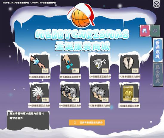 圣诞宝箱打开有一定概率获得金色圣诞宝箱,打开金色圣诞宝箱需要金色圣诞钥匙,金色宝箱概率更高概率获得珍稀道具。圣诞普通服装兑换券和圣诞超级服装兑换券可以在圣诞装商城中兑换稀有道具或节日限定服装。