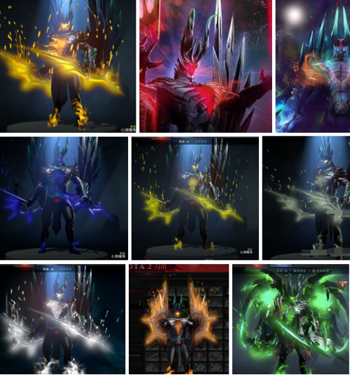 恐怖利刃的至宝“心渊魔角”相当特殊,它可以打棱彩宝石,给了玩家相当多的DIY空间,从原版的暗之倒影,到结晶青空深邃各色蓝,青翠大地原谅绿,瑰丽玛瑙的基情紫,曼恩薄荷米黄马裤的灰色系,耀眼的土豪金系,还有绒毛胡桃这样DOTA里少见的粉樱配色。