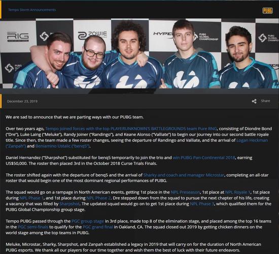 Tempo Strom官方发布的推文中,回顾了Tempo Strom自成立以来所经历的一系列人员变化以及所获得的成就。自2018年7月Tempo拿下Pan-Continental邀请赛冠军后,逐渐展现出了统治力,2019年参加的九项赛事中收获五项赛事冠军,成为北美地区传奇战队。同时战队也感谢了选手们付出,祝福选手未来发展顺利。