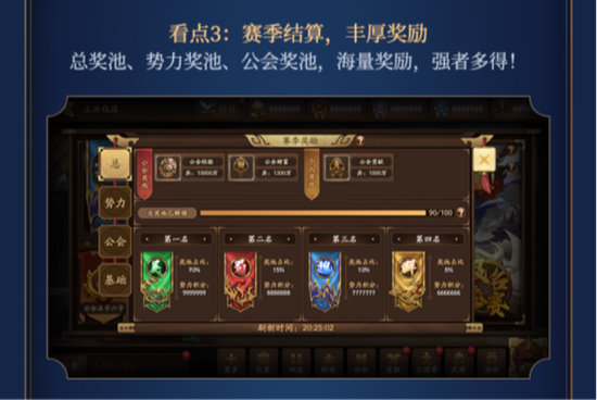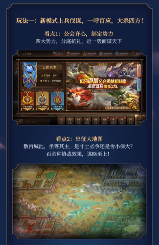 上兵伐谋,一呼百应,大杀四方!玩家想要体验上兵伐谋这一新模式,需要先加入一个公会,绑定一方势力,与公会的各位小伙伴一起协力作战。在这里,玩家可以与公会小伙伴一同出谋划策,攻城略池。有着巨额奖金的总奖池、势力奖池、公会奖池也将在每个赛季进行结算,强者多得,玩家们可通过智慧与谋略进行夺取。海量奖励、数百城池将花落谁家?非足智多谋的你莫属!