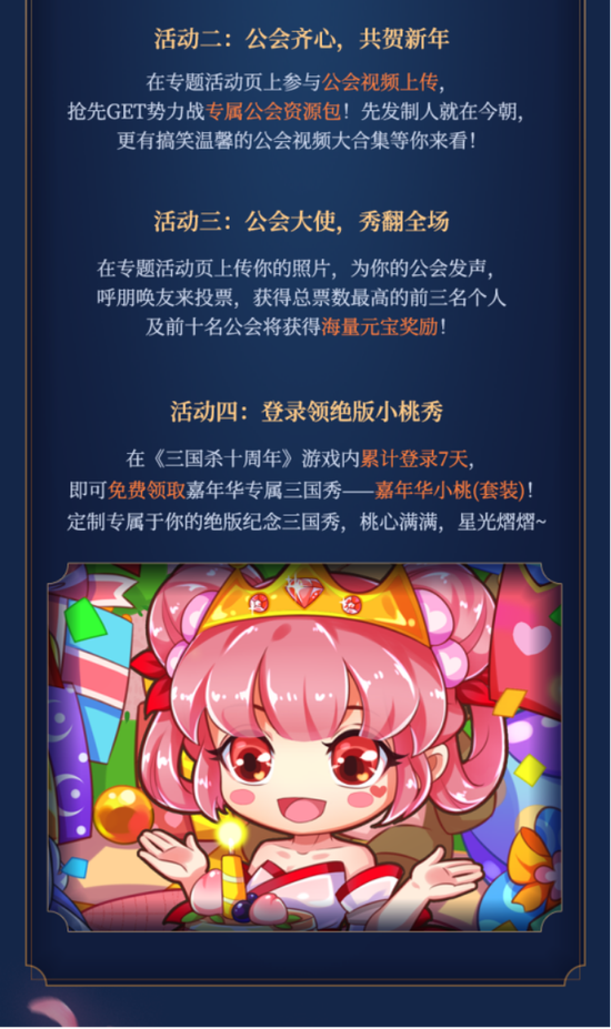 超Q萌可爱的绝版小桃秀有没有暖化各位少男少女的心?只要在《三国杀十周年》游戏内累计登录7天,即可免费将桃心满满的小桃秀抱回家。
