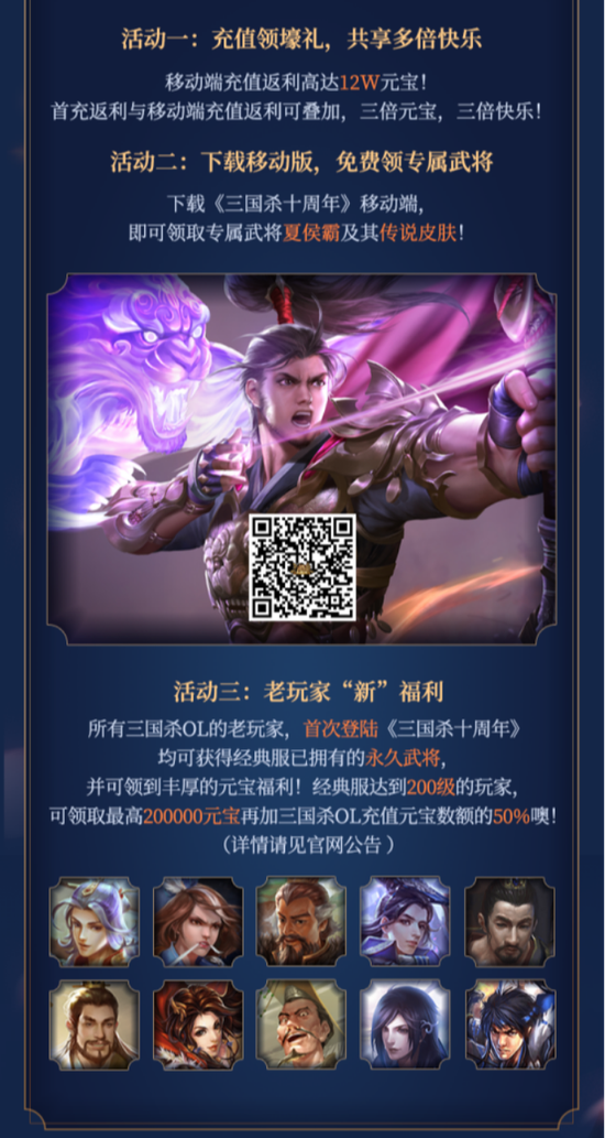 除了年终资料片多重玩法以及《三国杀十周年》周年庆主题页面上的多种福利活动外,在游戏内也有诸多福利活动等待玩家们参与领取。充值返利领海量元宝、免费专属武将以及给老玩家准备的“新福利”,福利多多、欢乐多多,只要你来,就能领取。