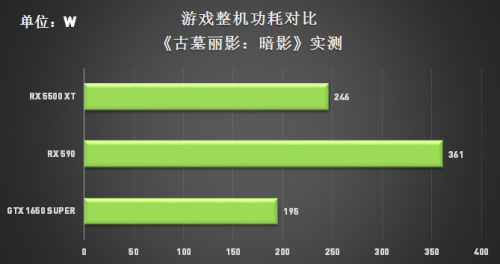 当然相比于 RX 590 与 GTX 1650 SUPER,RX 5500 XT 也有其优点,比如比起 RX 590 拥有更低的功耗,但是 GTX 1650 SUPER 的功耗更低。据在游戏《古墓丽影:暗影》中进行实测,RX 5500 XT 的整机功耗高达246w,RX 590 更是高达361w,而 GTX 1650 SUPER 仅195w,低功耗不仅仅能省电,更是代表着一个安静的游戏环境。而比起GTX 1650 SUPER,显存高达8G,但定位于1080p级的游戏很少能用到8G的显存,普通玩家4G的显存也已足够,而需要8G显存的游戏大作,入门级的 RX 5500 XT 又不够看,可以说是食之无味。
