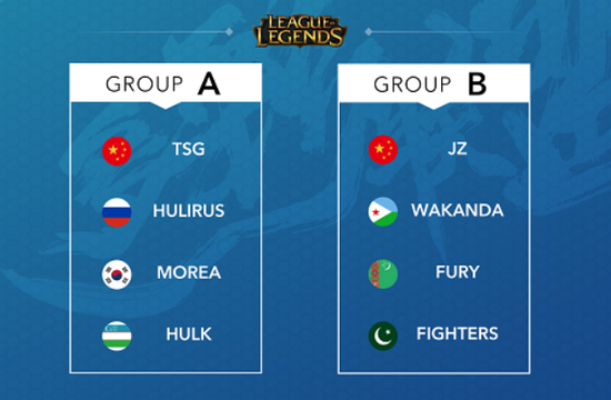 《英雄联盟》项目分组分别为A组:中国、俄罗斯、韩国、乌兹别克斯坦;B组:中国、吉布提共和国、土库曼斯坦、巴基斯坦。