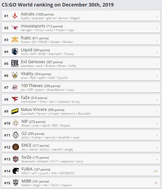由于最后一周没什么赛事,所以整个榜单几乎没什么变化。榜单前 13 名依旧,Astralis、mouz、fnatic、Liquid、EG 分列前五。TYLOO 再次下降一位,来到第 24 名。而 OG 的排名上升至 26 位。