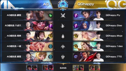 第三局AG超玩会更换打野,月之轮换接下来收获奇效。虽然Giao的兰陵王发挥逆天,连续帮助队伍拿下一血、暴君和主宰取得领先。但中期老帅抢到暴君逆天改命,AG一波一换四逆转局势,打出气势的他们连续团战击溃QGhappy扳回一局。第四局麟羽再度上场,找到月之轮换神奇感觉的AG超玩会势不可挡,从前期开始在野区资源和兵线上遥遥领先。虽然QGhappy巨大劣势中打出几波不错团战,可惜最终经济差距让他们无力回天,AG超玩会扳平比分。