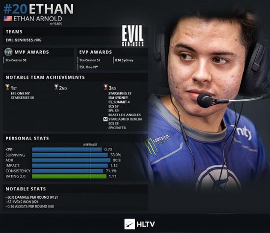 简而言之,Ethan是2019年度最佳战队之一Evil Geniuses的关键性人物。在TOP20参考赛事中(有MVP评选的大型赛事),他的ADR(80.8)排名第13位,每回合助攻数排名第8,残局获胜次数(67)排名第2。或许最后一项数据会让人感到意外,但是需要强调的是,Evil Geniuses打过的地图数排名所有队伍的第2名。