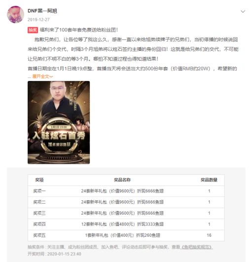 首播期间,黑一阿旭也在直播间和鱼吧给粉丝发放了大量福利 (共500份DNF年套, 价值20WRMB),可见黑一阿旭对粉丝的关爱和大方。