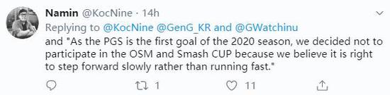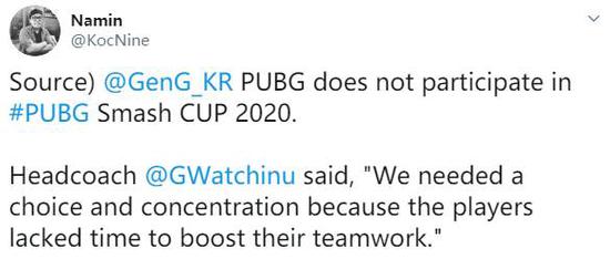PUBG选手Namin在个人推特表示:Gen.G将不会参加本月16日举办的Smash CUP 2020(英特尔挑战者杯)。