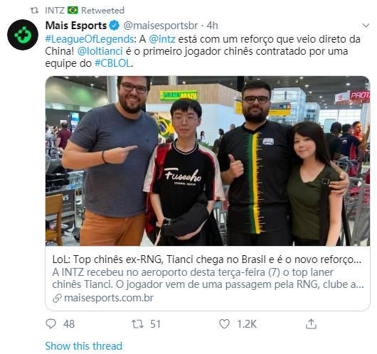 今天早上,巴西豪门战队INTZ转发巴西媒体MaisEsports报道,确认前RNG上单天赐正式加盟。