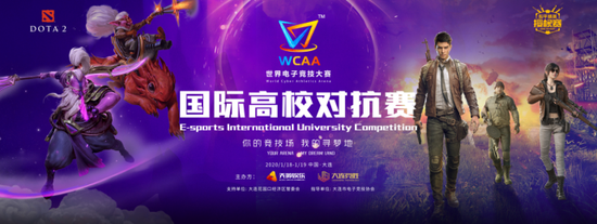 由大连天神娱乐股份有限公司和大连竞胜科技有限公司主办“WCAA2020国际高校对抗赛”是“WCAA世界电子竞技大赛”的系列赛事。定于2020年1月18日-19日,在大连举办。本次赛事由大连花园口经济区管委会作为支持单位,大连市电子竞技协会作为指导单位,由“京东游戏”独家冠名,中国银联·云闪付、自然堂、华硕ROG、西伯利亚、血手幽灵、傲风、他能量、伯力爵、凯仕丽酒庄10家异业品牌赞助,斗鱼直播平台独家同步直播(房间号:7947016)。本次赛事奖金池高达192万人民币,比赛项目包括《和平精英》和《Dota2》,邀请了来自中国、印度、俄罗斯、加拿大、马来西亚共5个国家、20所名校、100名 “学霸”选手参与。