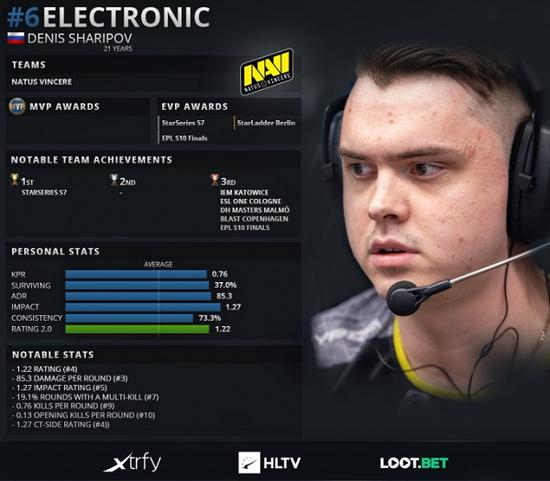 今天登上2019 HLTV TOP20榜单的是来自NaVi战队的Denis "electronic" Sharipov ,他在这份榜单上高居第6位,同时这也是他个人职业生涯第二次登上TOP20的榜单。