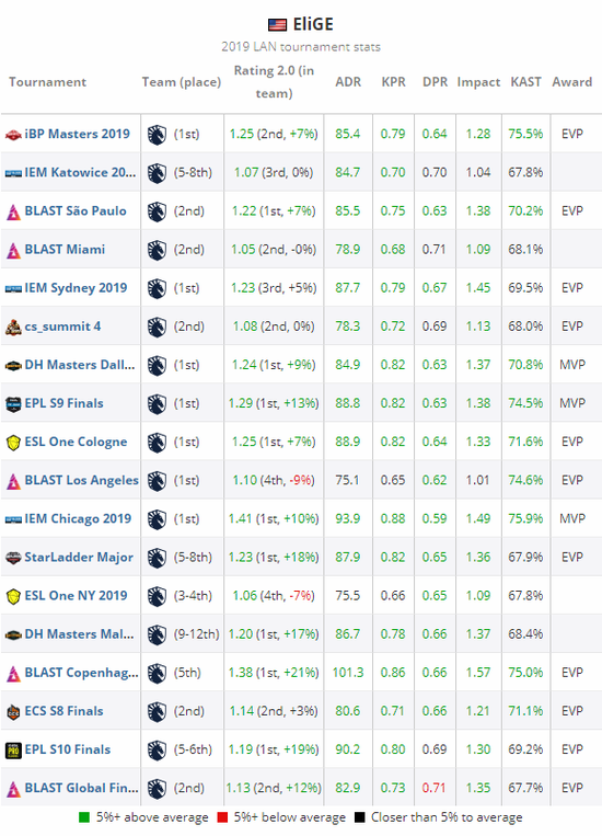 EliGE参加的每一场比赛Rating至少都在1.05之上,而且还在18场赛事中拿到EVP选手之称。在巅峰的5到7月里,他还获得了DH达拉斯、EPL S9和IEM芝加哥的MVP及IEM悉尼、ESL One科隆的EVP奖牌。此外,凭借其他出色的表现,3个MVP和11个EVP奖项也使EliGE成为2019年获得最多奖项的选手。