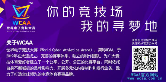 世界电子竞技大赛(World Cyber Athletics Arena),简称WCAA,由大连竞胜科技有限公司主办,于2019年在大连成立。完善的赛事体系、独立的制作团队,为广大竞技体育爱好者建立了一个公平、公开、公正的比赛平台。同时依托自身不断崛起的品牌影响力,开展多元化内容制作和发行业务,致力于打造全球领先的电竞体育赛事品牌。
