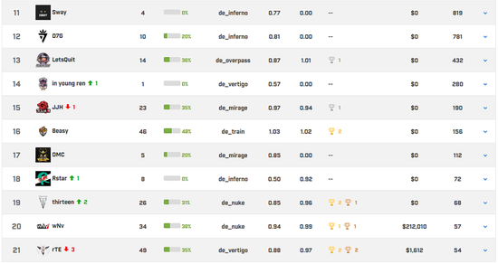 经过这两场赛事之后国内前三的地位依然无可撼动,IG则是因为Koshak离队受到了不小的影响,目前已经掉出前五。而TYLOO.Fe通过竞技宝·5EPL邀请赛 S1排名上升到了第9位。