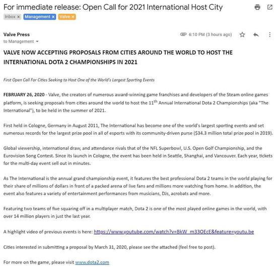 在邮件的首行,V社就表示这是他们第一次公开接受各个城市对这个世界上最大的竞技赛事的举办申请。