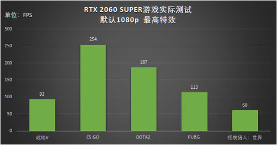 如用RTX 2060 SUPER在1080P的分辨率下,《CS:GO》帧率达到了254 FPS,而《DOTA2》中也达到了187 FPS,《PUBG》中达到了113 FPS,《战地V》中则拥有93 FPS,而《怪物猎人:世界》也达到了60 FPS。可以看到在《CS:GO》与《DOTA2》两款主流竞技游戏中,帧数均接近或超过了200 FPS,这对于玩家水平的提升是显而易见的,更能帮助玩家顺利上分,而在《战地V》与《怪物猎人:世界》这种3A大作中,2K分辨率下,帧数也超过了60多帧,足以保证玩家的流畅游戏。