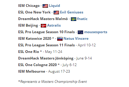 在Liquid只用了63天就拿到IGS S2赛季的冠军之后,赛事方调整了规则。一支队伍需要拿下10场赛事中的四场,其中一场需要是大师级锦标赛,对于2020年,这些赛事将是IEM 卡托维兹、ESL One科隆站和ESL One里约Major。否则,他们需要赢下10场赛事中的六场才能拿到奖金。