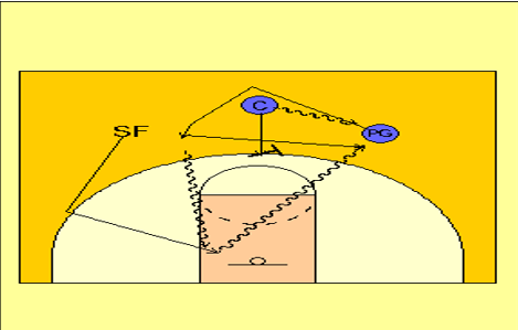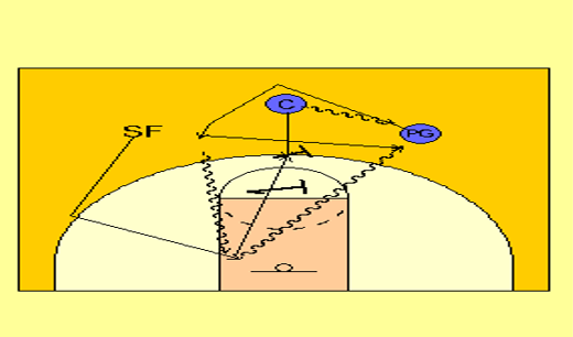 对方的内线提上来防守,C同样也是要用小力快速吸到对方内线,然后将球传给PG,随时做好为PG做掩护的准备,此时PG需要注意观察SF的走位情况,随时将球传给空切上篮或者反跑投篮的SF。