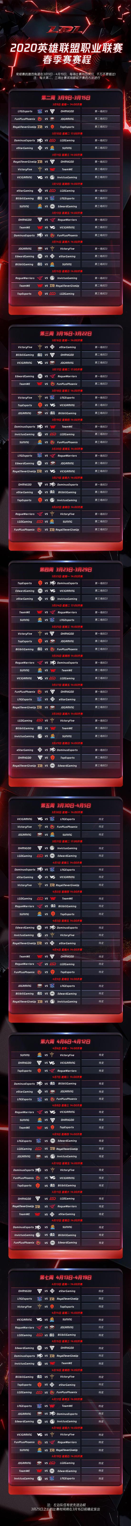 根据官方公布的赛程可以看出:每一周的比赛仍然以连续7天的形式进行,除第二至第五周(即3月9日-4月5日)每周二进行2场BO3外,其他比赛日均会进行3场BO3比赛。另外,每天的第二、第三场比赛将采用顺延开赛的方法进行,一起期待即将到来的LPL线上赛吧!