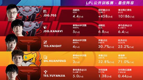 其中坐拥上单位最高KDA4.4和最高单次阵亡承伤的705正在努力成为JDG新一代稳中带C的上路大腿,TES新人辅助Yuyanjia15分钟参与击杀排名辅助第一,对于视野的掌控也不输其他队伍的老牌辅助。knight和Huanfeng的三项数据全部在各自位置位列第一。此外作为五队ADC中唯一没有LPL参赛经验的小将,参战率高达71%的Huanfeng绝对是未来LPL春季赛中值得期待的耀眼新星。