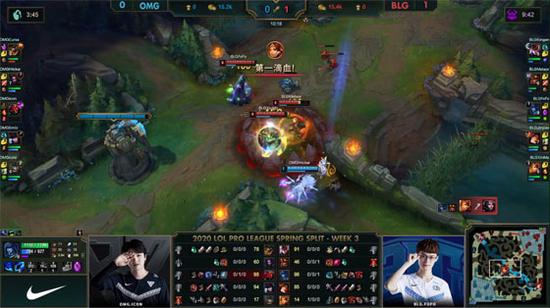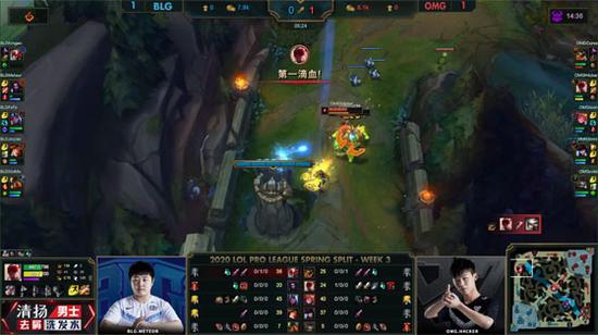 OMG趁BLG中路无人防守时放出第二只先锋撞掉一塔,不过辛德拉又被蕾欧娜ER开到,奥恩传送落地大招将其带走,BLG打出0换2转身直接rush掉大龙,下路组牺牲自己保证盲僧无法抢龙,BLG还是打出2换3大获全胜。24分钟OMG上路高地失守,盲僧大招失误把EZ送走,BLG得以团灭OMG,EZ砍下三杀一波结束比赛,BLG1-0先下一城!