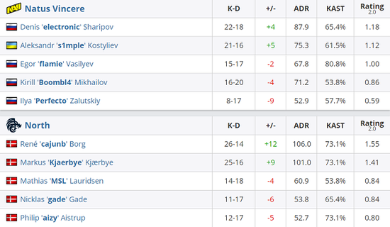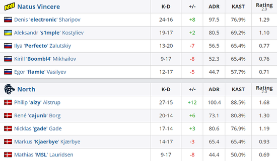 来到NaVi选择的Dust2,他们没能复刻自己IEM卡托维兹时期的完美发挥,相反aizy在这张地图上火力全开,上半场开局North就是一口气连拿六分,终于凭借s1mple的大狙和electronic大胆前压NaVi终于开始扳回分数,上半场结束,5-10的比分本身就让NaVi压力很大,而下半场aizy的手枪局四杀就是压死骆驼的最后一根稻草,成功收下对手的刚枪局和eco后14-5的比分已经是稳稳的了,剩下的时间里NaVi也仅仅是略作挣扎最终败下阵来。