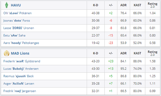 A组决赛成为丹麦二哥和芬兰二哥的决斗,在第一轮的交手中HAVU曾经2-1取胜过,但来到关键的决赛,MAD Lions这边还是展现出更为强大的实力。图一Mirage上HAVU的残局表现实在是糟糕,上半场本能咬住分数的他们连续输掉二打一的残局,让他们的士气狠狠受挫,来到下半场,第二十回合acoR在A区完成狙击五杀秀后,HAVU再无力抗衡,最终以10-16输掉图一。