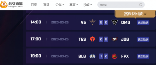 3月25日,虎牙LPL春季赛常规赛第四周第三个比赛日继续开战。首战V5迎战OMG,骇客连拿两把蜘蛛,给观众分别上演了优劣势精彩教学,马哥穿甲维鲁斯豪取四杀,OMG2比0拿下V5!第二场TES迎战JDG,Knight9Carry属性拉满,维克托爆炸输出,潘森打开局面,连夺两把MVP,恭喜TES2比0拿下JDG。第三场BLG对决FPX,首局Kingen鳄鱼表现出色,100%KP帮助BLG先下一分,第二局FPX又是贯彻传统4包2战术,打崩BLG下路,双方战至1比1,第三局Doinb塞拉斯疯狂回血,团战七进七出,最终带领小凤凰2比1战胜BLG。