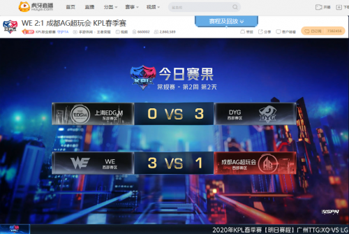 北京时间2020年3月26日,虎牙KPL春季赛常规赛第二周第二个日正式开战。首战上海EDG.M迎战DYG,重磅引入强援久诚的DYG状态火热,上一轮先是零封劲旅RNG.M,此战他们再次零封老牌豪强上海EDG.M豪取两连胜。第二场比赛WE挑战成都AG超玩会,面对账面实力远超自己的成都AG超玩会,WE众将不惧银河战舰反而气势更盛火力全开,凭借全场碾压对手的正面团战三比一大胜卫冕冠军。