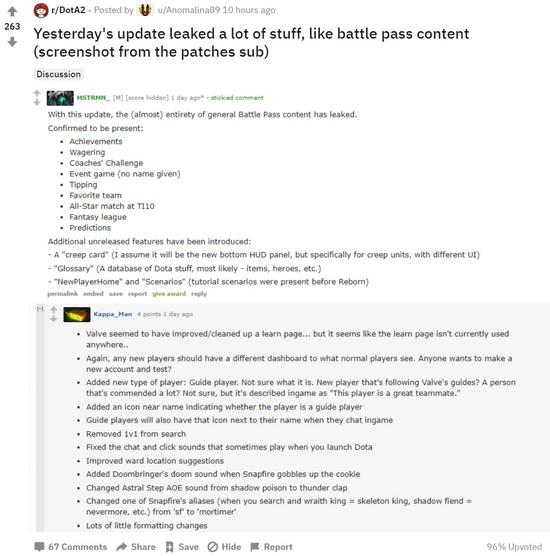 有Reddit网友发帖称,本次的更新包泄露了大量的内容,其中就包括TI10勇士令状的相关内容。