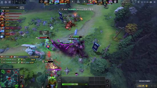 13分钟,中路开团,玛尔斯框大后老奶奶开大掩护队友,NIP退回塔下却遭到了OG不理智地追击。你方唱罢我登场,NIP由猛犸小狗带队反击,先杀紫猫后留巨魔,赶来支援的赏金和神谕也被悉数击杀。三分钟后,中路再度爆发团战,但这次胜利属于OG——紫猫率先将NIP双酱油切死,随后老奶奶开大伤害炸裂,双大哥带队追击斩杀猛犸,顺势打了NIP一波小团灭,紫猫拿下三杀。18分钟,轮到巨魔表演,OG以赏金为代价换掉了敌方精灵小狗。23分钟,双方在肉山处开战,一番拉扯之后,精灵被OG带走然而巨魔却被小狗收下人头。此后OG DOTA再度开始,丝血紫猫于人群之中带走了玛尔斯。