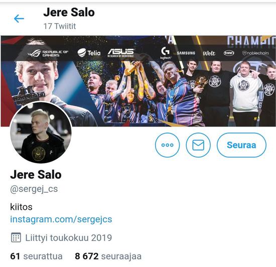 在过去,sergej的推特个人简介会写着“ENCE战队CSGO职业选手”,但现在只写着芬兰语的“谢谢”。