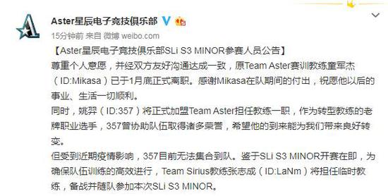 基辅Minor开赛在即,茶队作为中国赛区出线队伍目前已经集合。而在此次发布“Aster星辰电子竞技俱乐部SLi S3 MINOR参赛人员公告”时,正式官宣357加入Team Aster担任教练一职,但是由于疫情影响还无法集合到队,因此此次出国将带上天狼星的教练国土参加此次Minor比赛。