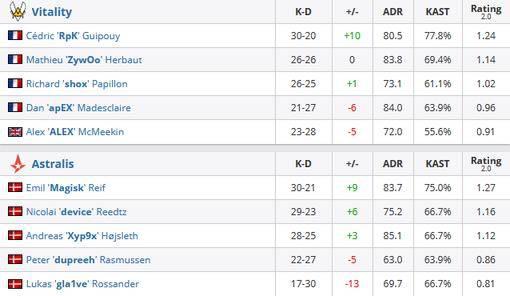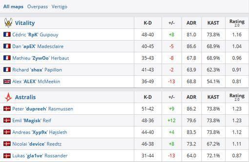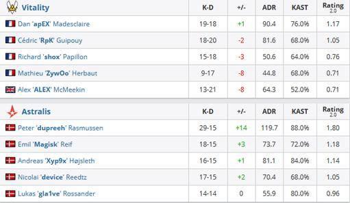 第28回合,apEX在A区连斩两人,队友骚扰后自己再次双杀,带领Vitality扳回比分。次局Vitality再次搜点失误被Astralis赚取一个人数优势,好在RpK埋下雷包后连杀2人拿下赛点。第30回合,Vitality提速一波rush,虽然占领B区,但是被赶来的回防队员系数击杀,比赛进入加时。