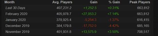 在2月份,Dota2的每日平均在线人数来到了405978人次,较1月份上涨了接近3万了,增幅达到了7%。这是自TI9之后每月在线人数增幅最高的月份,在TI9之后,Dota2的月平均在线人数每月都在下滑,仅在世外之争发布后短暂回升。而2月的最高在线人数也上升到了663812人次,比1月份上涨了5万人。