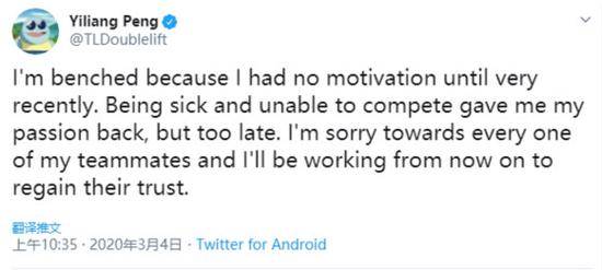 LCS第七周赛事来临,病愈归来的大师兄彻底守了饮水机——他将成为Tactical的替补,没有进入TL的首发名单。Doublelift对此作出了回应,反思了自己之前存在的问题,表示要好好努力,早日拿回自己的位置。
