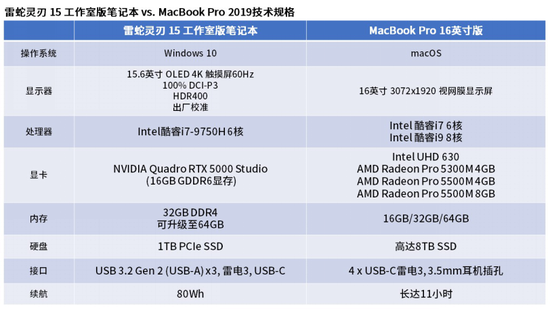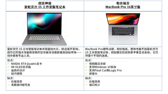 雷蛇灵刃15 工作室版笔记本和 MacBook Pro价格对比