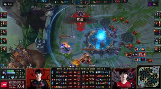 中期JDG两度大龙逼团,26分钟团战铁男深入敌阵砍下双杀,FPX三人倒地只得放弃大龙,推掉了JDG中路一塔。FPX中路高地水晶告破后,机器人钩回千珏将其集火秒杀,盲僧大招踢回厄斐琉斯,FPX打出1换3拖过了大龙buff时间,但JDG还是继续推进下路并凭借装备领先团灭了FPX,厄斐琉斯收获今年LPL春季赛首个五杀,这也是LokeN职业生涯首个五杀,JDG1-1扳平比分!