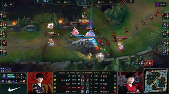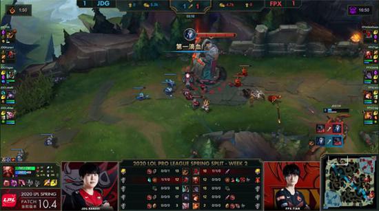 开局FPX入侵JDG蓝buff野区,机器人钩回铁男逼出其闪现,拉扯中FPX上野也交出闪现,撤退时女枪和队伍脱节跑到JDG塔下,铁男顺势拿到一血。