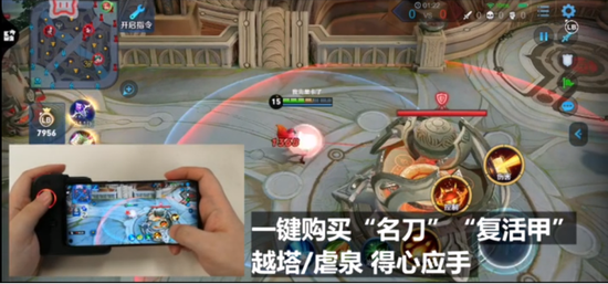 一键换装,按下手柄的十字键就能自动购买对应的装备。上名刀,下辉月,左血手,右复活甲。一键快速换一套装备,让玩家在游戏中仿佛有如神助,即使是玩高端局,也不在话下。