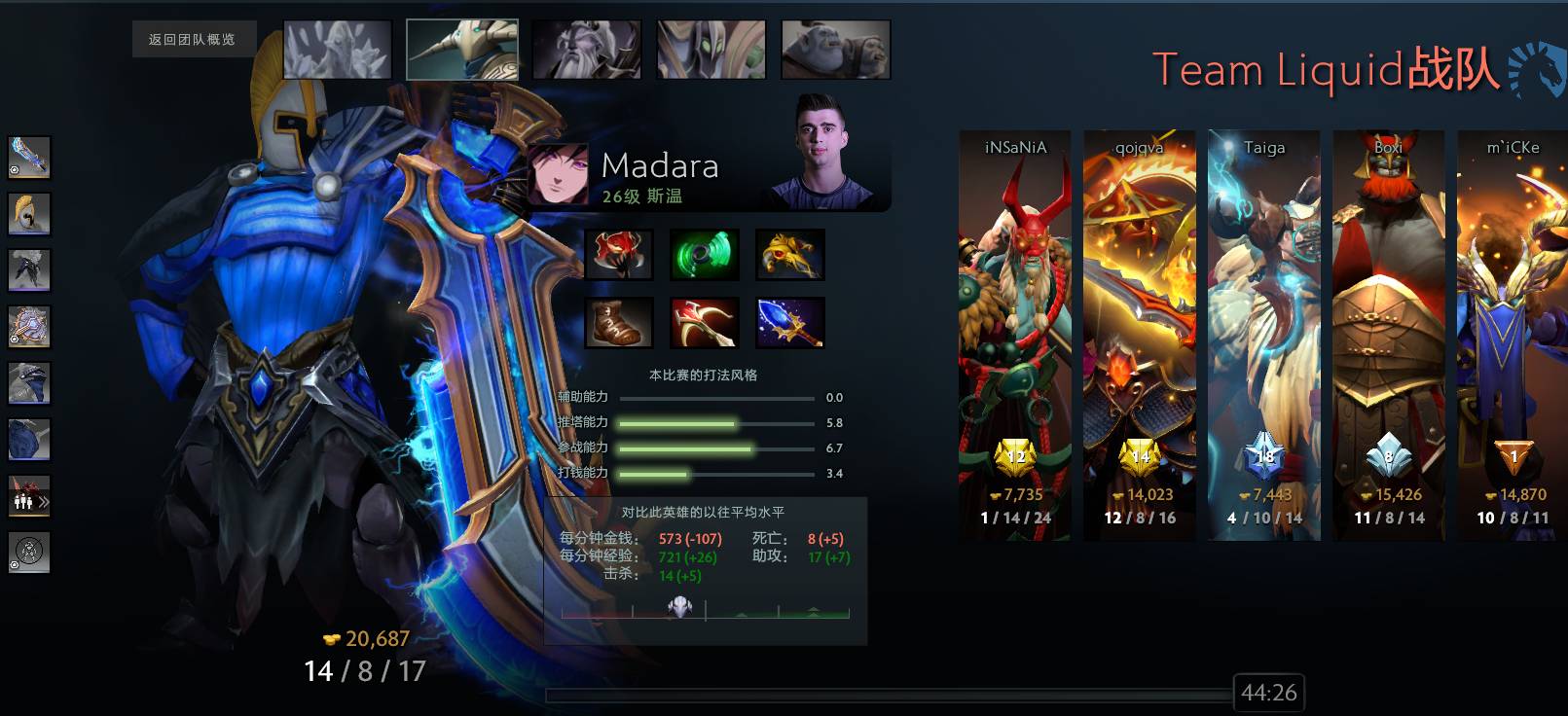 那个BO2的第一局,液体从头到尾只拿了四个人头——其中三个都是miCKe的水人拿的。有一说一,miCKe本人还是保持了不错的节奏。在队友疯狂支付的时候,他的阵亡次数始终为零。但因为Madara的剑圣实在太肥,液体根本挡不住OG.Seed的推进节奏。BO2的第二局,是本次巅峰联赛至今最血腥的一场比赛,两支队伍在25分钟的时间里爆发了45个人头——死了活,活了打,打了死,几乎每个人都深陷循环。对于前期发育不错的液体来说,这并不是一个好消息。反观OG.Seed方面,Madara的斯温倒是通过换人头的方式打出了半身神装。这局比赛的转折点是31分钟的中路团战,技能全开的斯温在马尔斯大招里秒掉了马尔斯。残局,麦克的SA也被斯温找到。这波团战结束后,OG.Seed掌控了游戏的节奏。44分钟,液体告负。