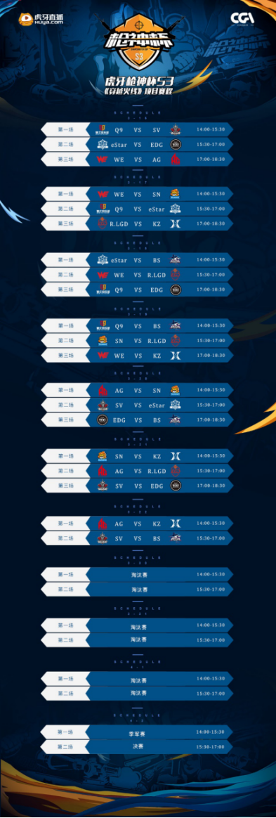 虎牙枪神杯S3赛季《穿越火线》项目即将于3月16日开赛,国内顶尖十支职业战队将通过3月16日--4月2日为期两周的线上赛比拼,决出枪神杯S3《穿越火线》总冠军!